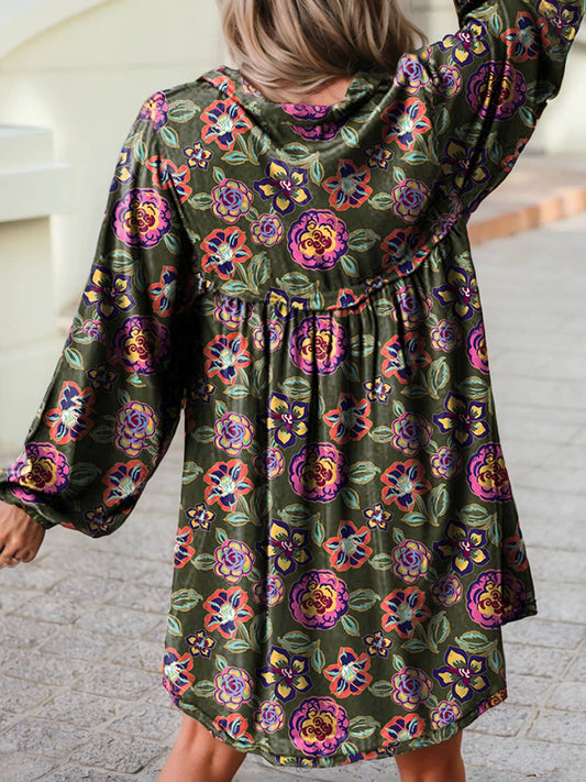 Floral Print Split Neck Long Sleeve Shift Mini Dress