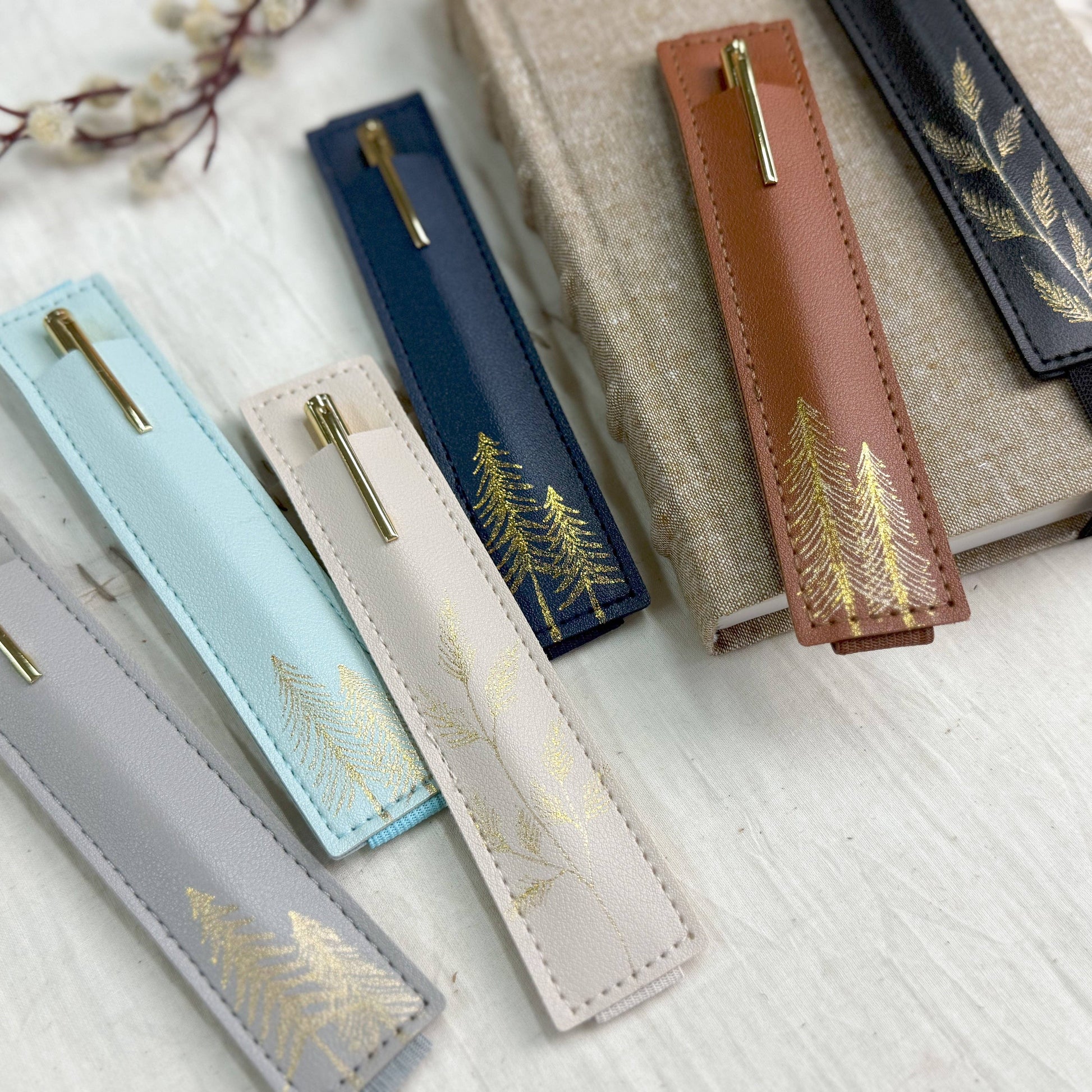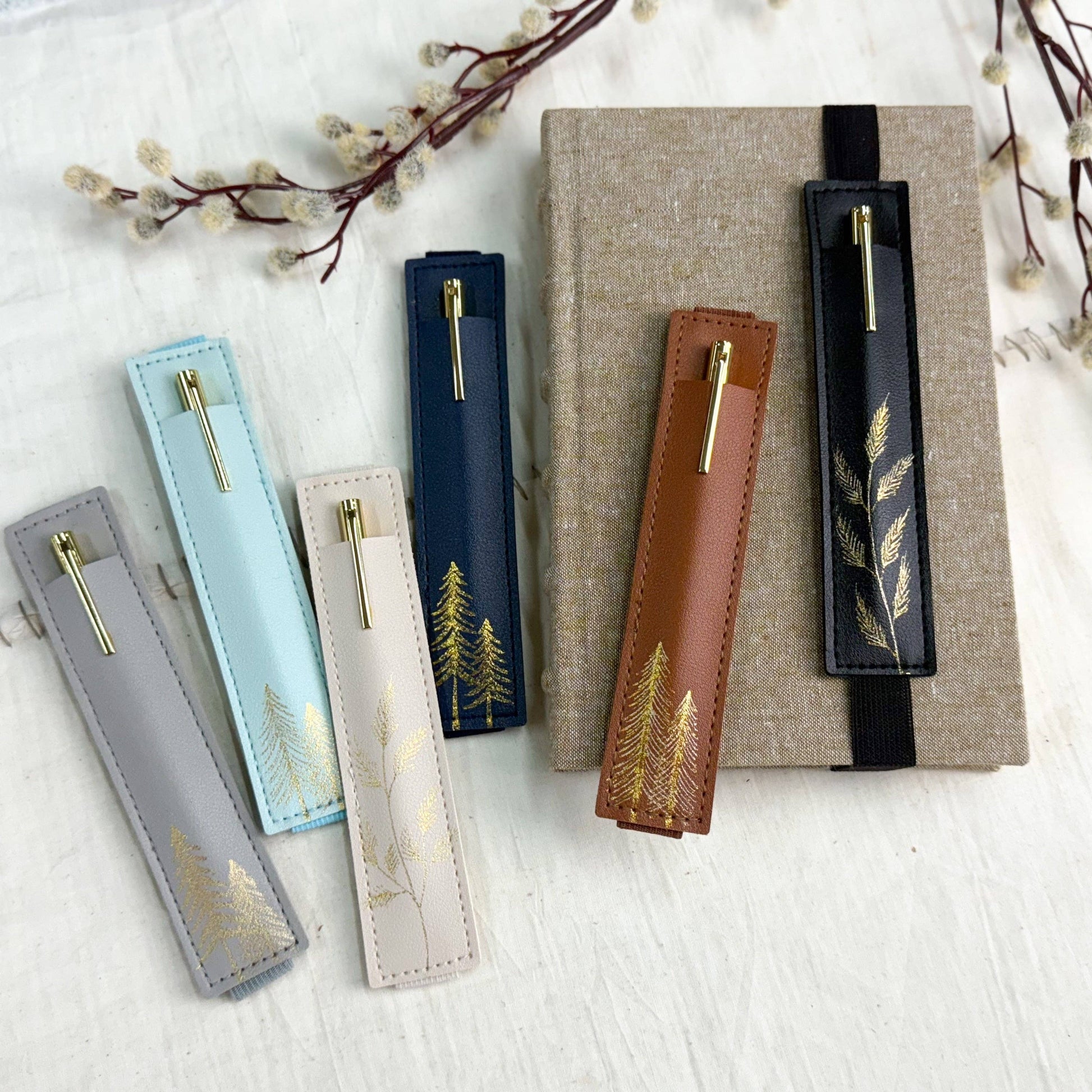 The perfect journal accessory! This elastic pen holder fits standard sized journals and books. They are hand foiled in a variety of trees and evergreen branches by our in house artist. Each design will be unique. Includes beautiful gold pen.